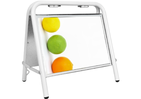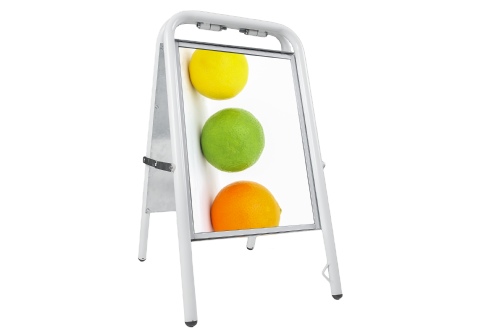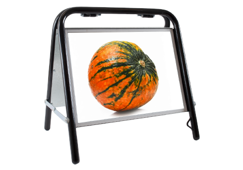 Gatuställ/Mäklarställ i format A3 cm (ark format). Kraftiga svartlackade 25mm rör som gör stället mycket stabilt. Levereras med magnet frontplast. Ett stabilt gatuställ som passar bra utomhus men som givetvis även går att använda inomhus.